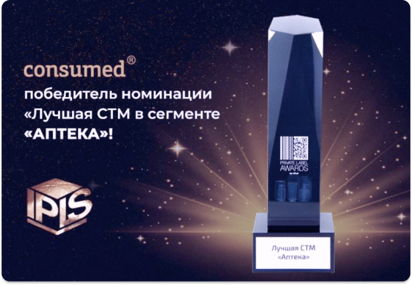 В этом году торговая марка CONSUMED впервые приняла участие в премии. Несмотря на многочисленное количество номинантов – брендов, давно укрепивших свои позиции на фармацевтическом рынке, торговая марка Consumed признана победителем в номинации «Лучшая СТМ в сегменте «Аптека»!